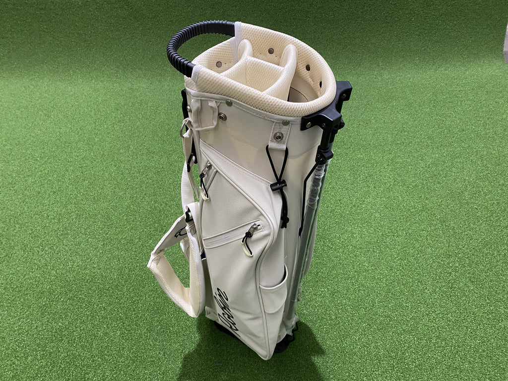 Robin 4-Way Stand Bag  Sleek, durable, and designed for performance, the Robin 4-Way Stand Bag combines luxury style with Leather Pockets and practical function. Crafted partially premium white leather, this stand bag features a 4-way top for easy club organization and multiple spacious pockets for all your essentials.